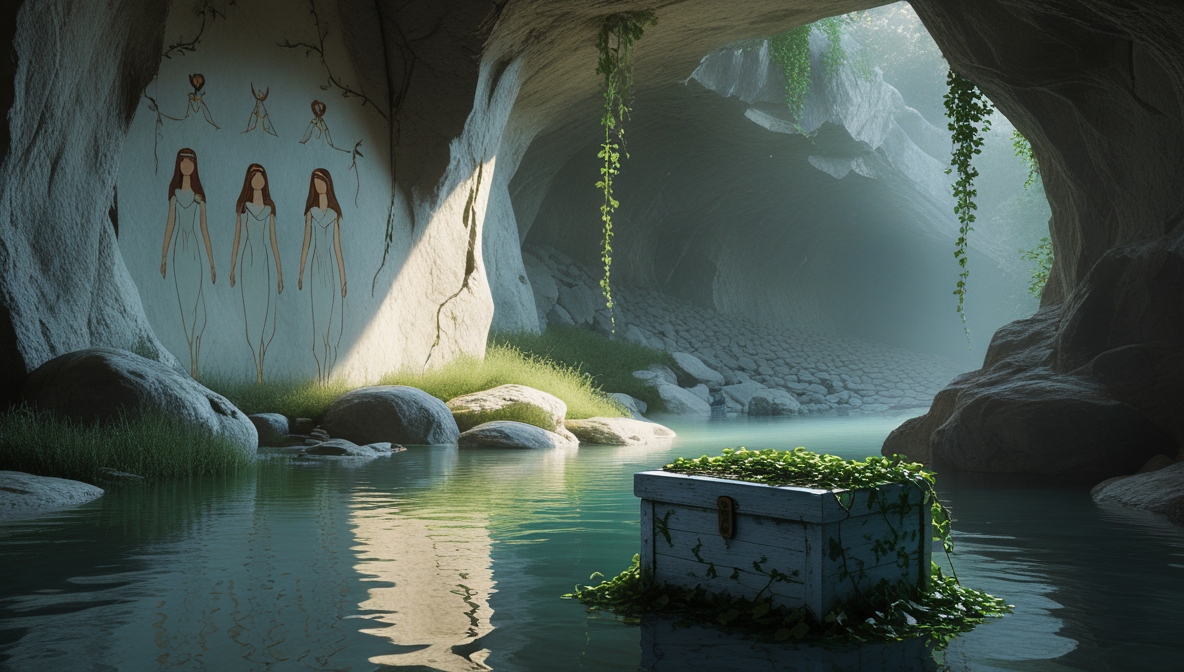 - In the center of the cave stands a tiny wooden box covered in ivy.