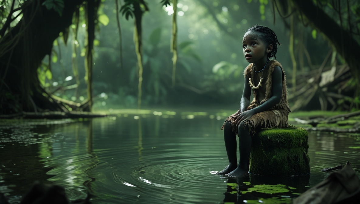 - Small human girl found crying on a mossy stone pillar in the jungle pond within Bone Speaker Jungle
